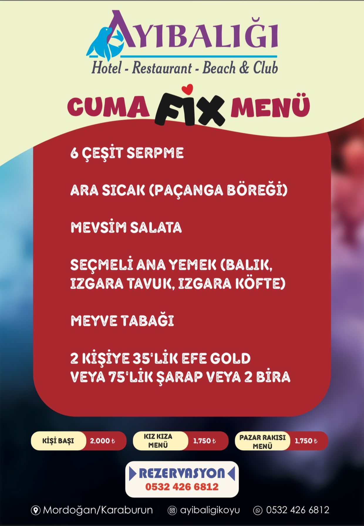 Ayı Balığı’nda deniz havasına en çok yakışan tatları özenle seçiyoruz. Taze deniz ürünlerinden günlük mezelerimize, ızgaralardan serinletici içeceklerimize kadar her damak zevkine hitap eden lezzetler sunuyoruz. Yerel ve mevsimsel ürünlerle hazırlanan menümüzle, sade ama unutulmaz bir tat deneyimi sizi bekliyor.
